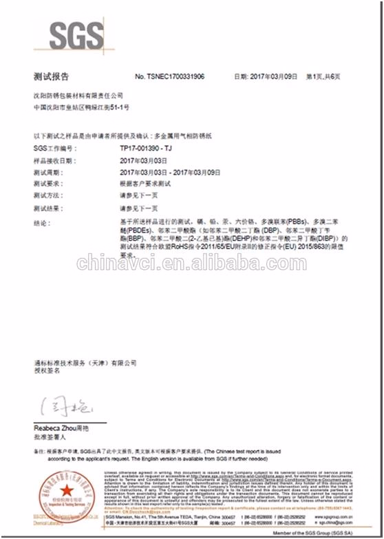 Unsere fü Hrenden Produkte haben 10 Serien (ü Ber 100 Arten), wie VCI Papier, VCI Plastikfilm, Rostschutzö L, lö Schbares Korrosionshemmnis, VCI puffernmaterial, Metalloberflä Chenbehandlungflü Ssigkeit und Edelstahl Interleavingpapier etc. Unsere Produkte fü Hren den SGS safty Leistungsprü Fung und passen sich an die richtungweisenden Bedingungen von EU RoHS und von 94/62/EC. An